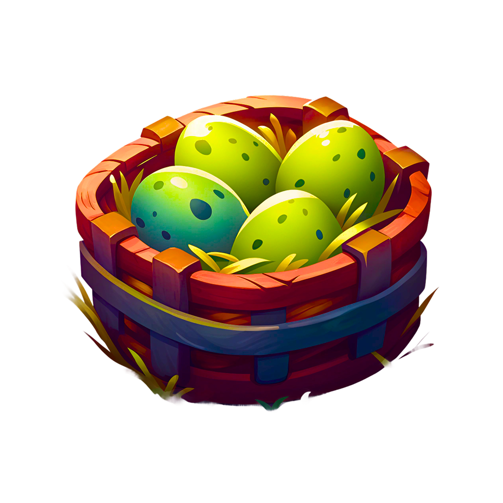Game 2 involves controlling two baskets to sort eggs. One basket is designated for fresh eggs and the other for rotten ones. The baskets have limited capacity, and once full, they will no longer catch eggs until they are emptied into a special field. Each egg caught adds to the player's score, with points increasing based on the fullness of the basket. Like the first game, health points are also at risk here; missing an egg results in a point deduction.